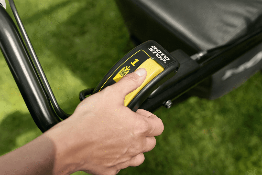 Võimaldab lõiketera peatada ilma mootorit välja lülitamata, mis on praktiline näiteks kogumiskoti tühjendamisel või liikumisel üle kõva pinna.